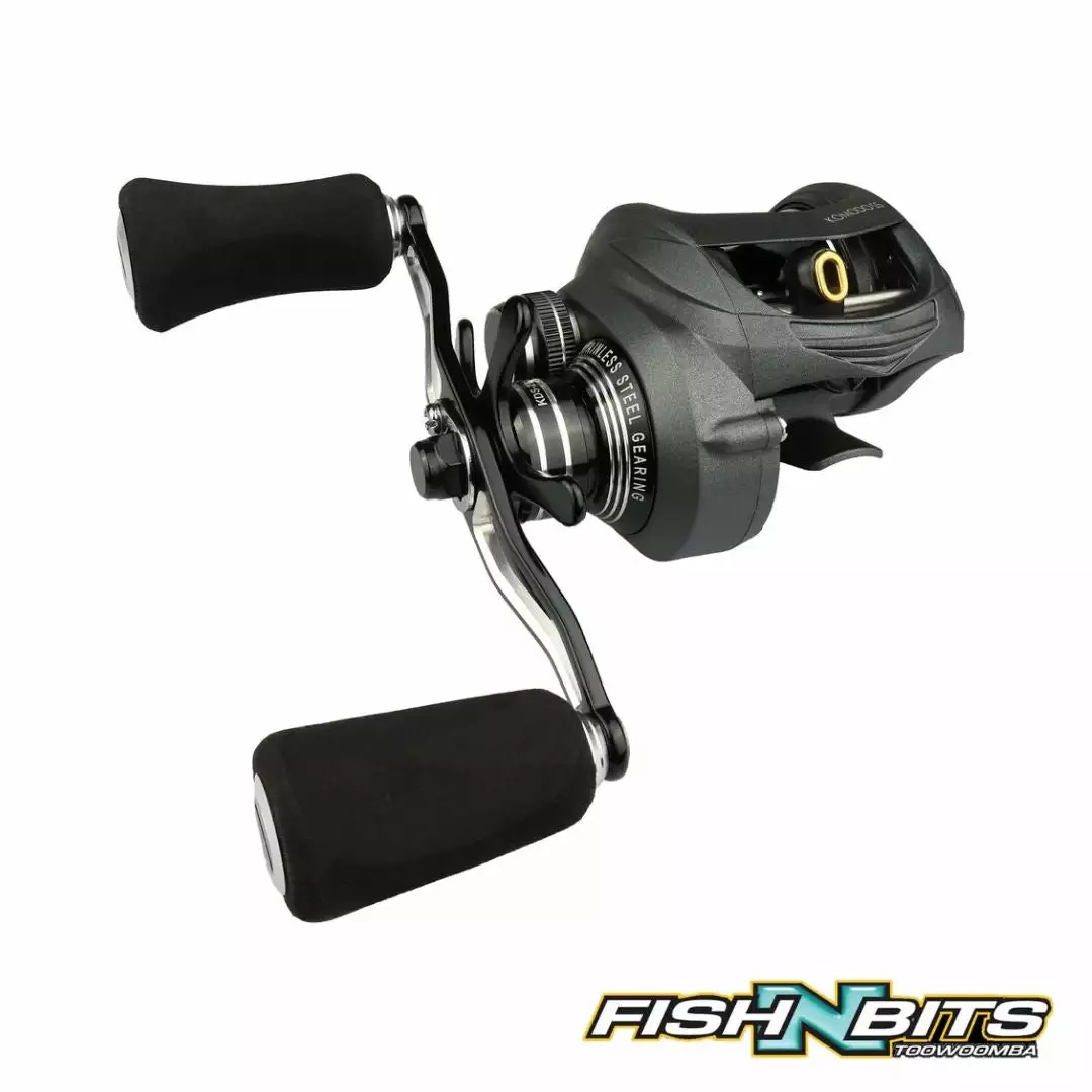 The ultimate stopping power in a baitcast reel, with a stainless steel main gear, pinion gear, drive and spool shafts for power and strength, plus plenty of drag output and features galore.